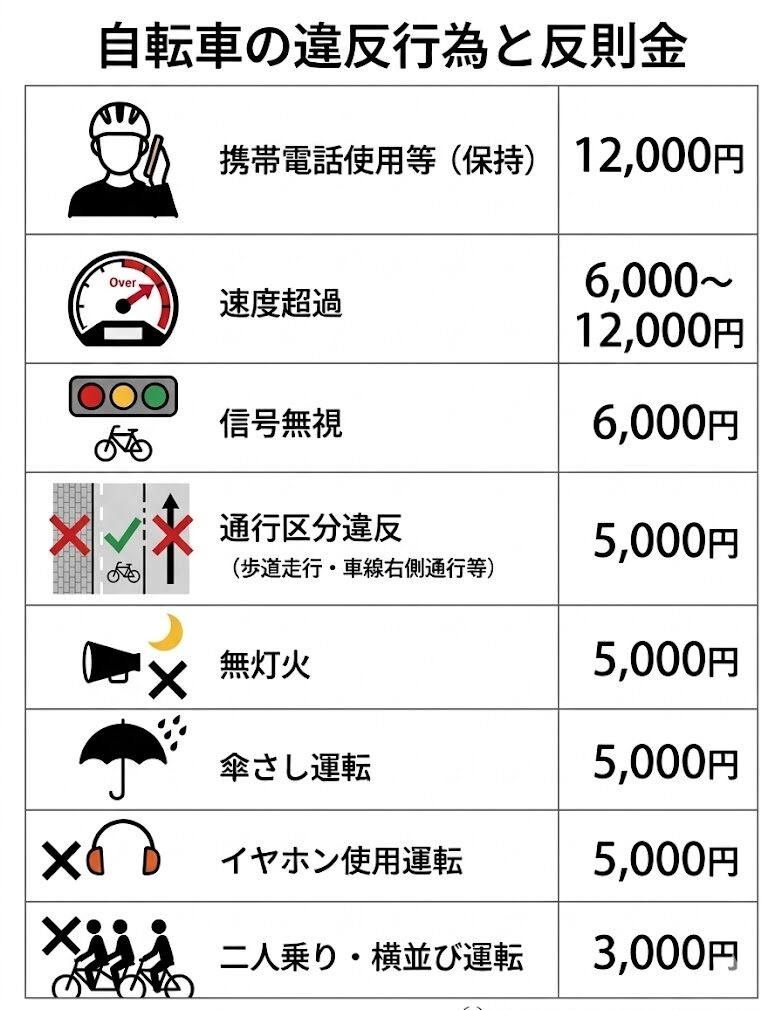 今回の改正で重要なのは、自転車がこれまで以上に「車両」として責任を問われることです。警察庁は「免許はなくてもドライバー」と明示しており、自転車利用者にも交通ルールの順守を強く求めています。対象となる違反行為には信号無視、指定場所一時不停止、通行区分違反、携帯電話使用等などが含まれます。