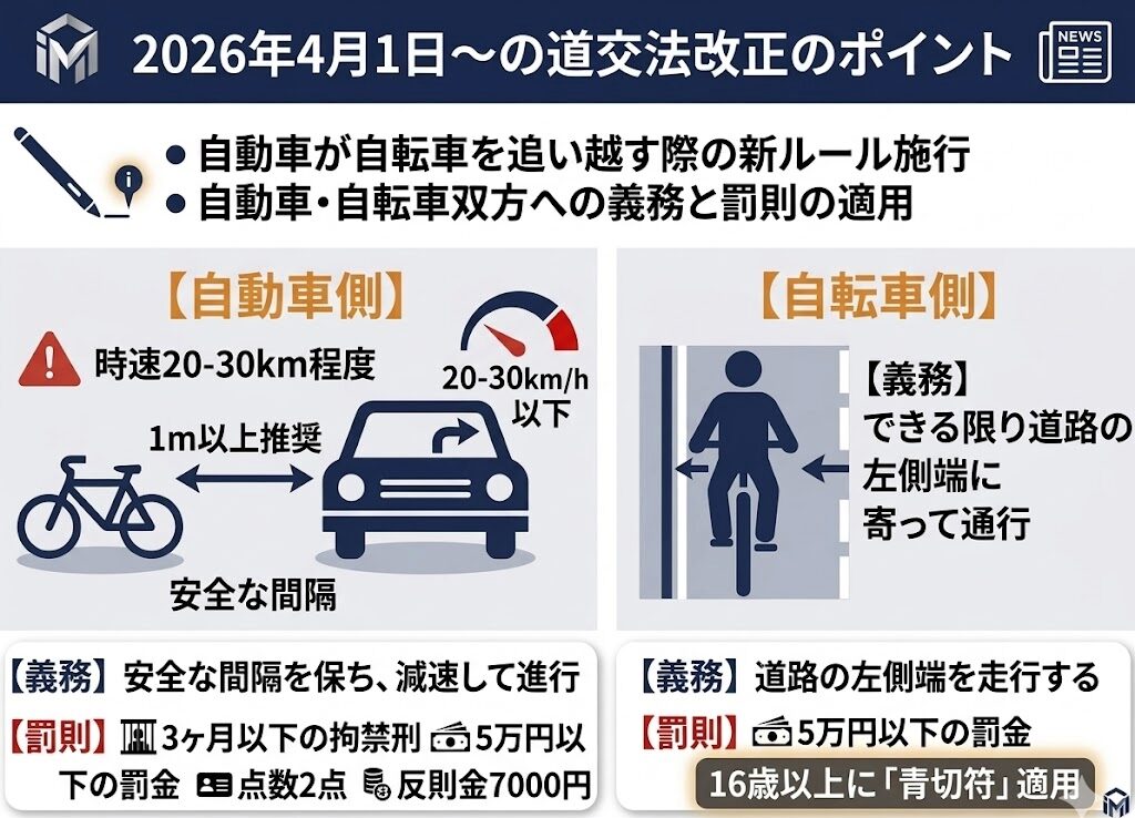 さらに同じ2026年4月1日から、自動車、一般原動機付自転車などが、自転車を含む軽車両や特定小型原動機付自転車の右側を通過する場合の通行方法も明確化されます。警察庁の概要資料では、両者の間に十分な間隔がないとき、自動車等は間隔に応じた安全な速度で進行し、自転車等はできる限り道路の左側端に寄って通行しなければならないと示されています。